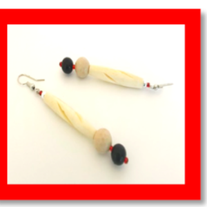 $7.00This is surely one for the books with anyone who loves to collect accessories! The TRBE-2 is a statement tribal piece from start to finish. This piece predominantly sports a tabular bone and attached to the ends in a sandwich fashion are cream and black glass beads with red and silver beads. If you are looking for that little zing or spice, this is one that promises to deliver on all fronts. We like to create pieces that speak to our customers on multiple levels. We go beyond creating earrings to giving you an experience and connection with your roots. If you have a culture lover in your life, this is one piece that will strike a chord with them. Pierced or clip-on available.