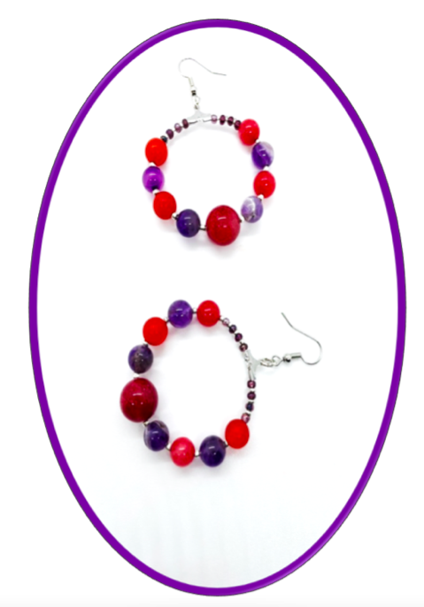 Circular earring with amethyst & coral glass beads, centered with semi-precious agate bead. BASE-4