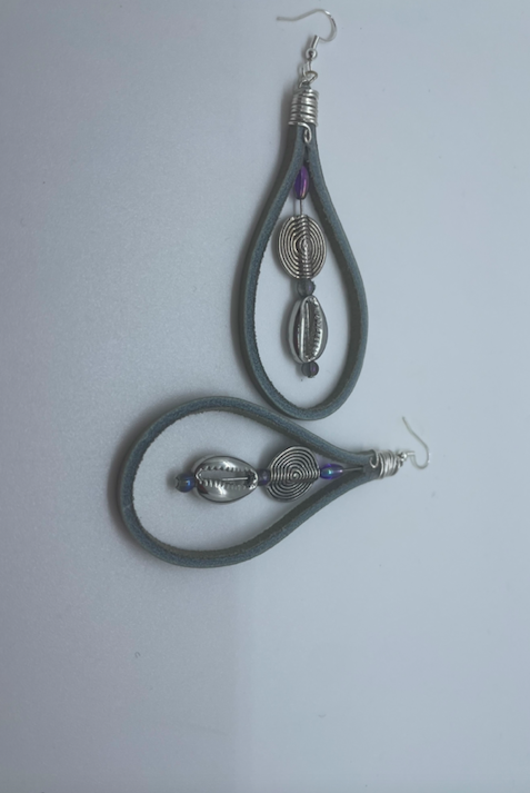 Gray Teardrop with Silver Cowrie Shell, Iridescent Beads a Wire