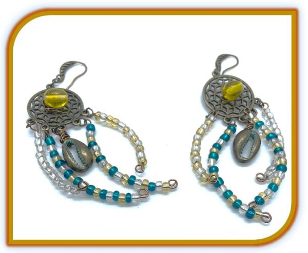 The DCE-1 earring is a more contemporary take on the gypsy dream catcher. This earring features a bronze center piece which appears webbed but instead of the yellow bead like its predecessor, this centerpiece carries an amethyst bead. Hence, it’s a no-brainer that an Aquarius or someone born in February would appreciate this as a gift. The DCE-1 also features a cowrie shell surrounded by colorful glass beads. It could be a great choice for a date, casual event or even a work meeting. The design of this earring is very mystical, alluring and some might even say retro.DCE-1 is such a bold set it is sure to complement its wearer’s ensemble and personality. It would be a fantastic choice for anyone who loves the arts.