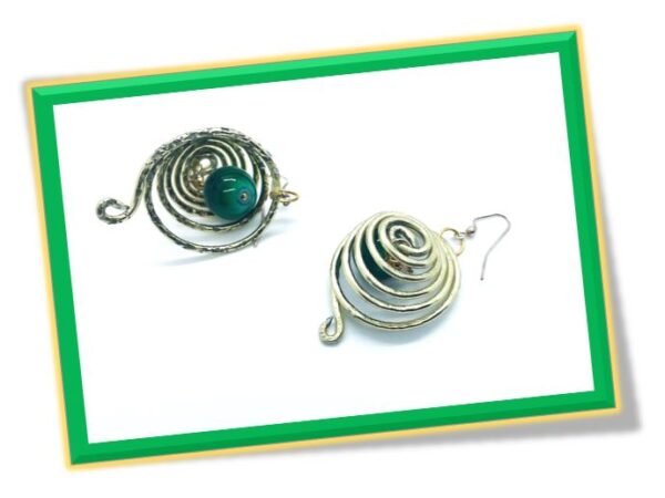 This earring is from the hypnotic collection.  It features a gold wire wound into concentric loops with an emerald bead at the center. They can be paired with the necklace or wore alone as they will add pizzazz to any ensemble.