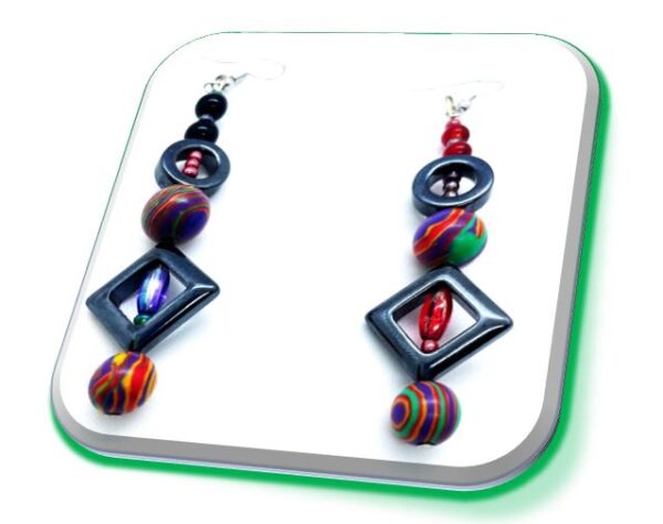 Here is an earring that’s incredibly artistic. Featuring shapes and colors in different dimensions, DOKE-30 is a refreshing approach to jewelry. The design of this earring portrays these shapes resting atop each other in the vertical axis, descending to form one unique type of drop earring. From the midnight black beads at the top to the circle with a coral in the center, down to the amethyst cone shaped bead surrounded by the hematite diamond, there’s a lot of pizzazz in the DOKE-30 and this is just on one earring. Remember, this earring is from the Different is OK earring collection which means that the arrangement of the second earring is different from the first. However, both earrings are similar until analyzed closely. The second earring has garnet beads at the top with amethyst seed beads and a garnet cone bead. The DOKE-30 would be a great choice for casual events with friends or family. The earring does have a lot of edge and it works for different age groups too.